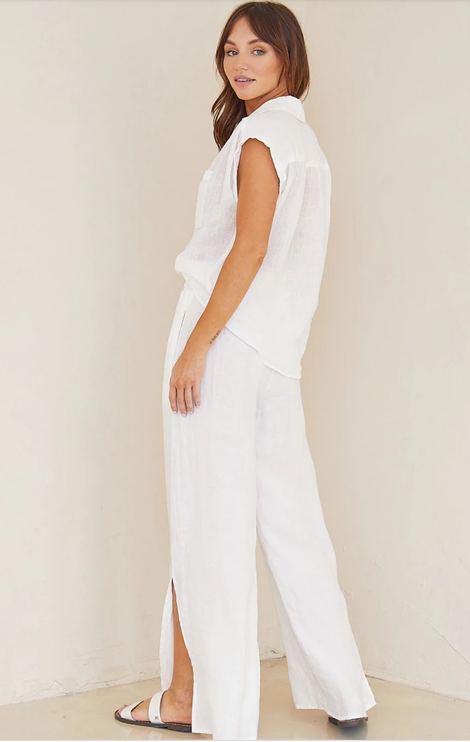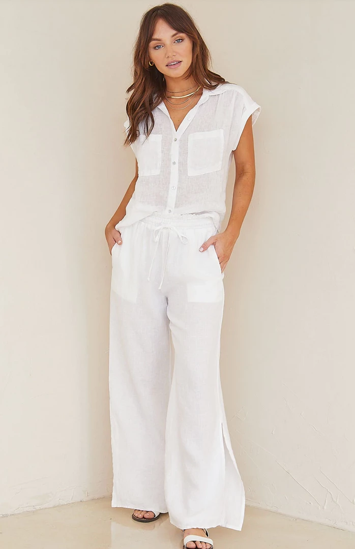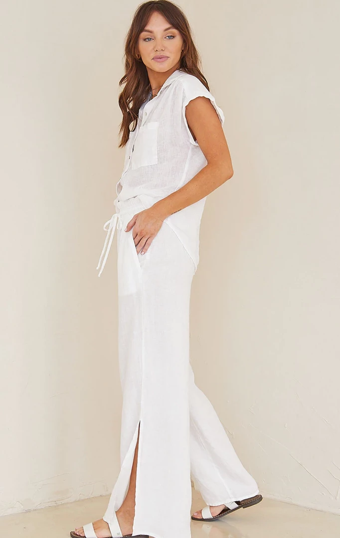 A wide leg, high waist pant with a drawstring tie, side slit pockets, and side openings down each leg. 100% Linen
