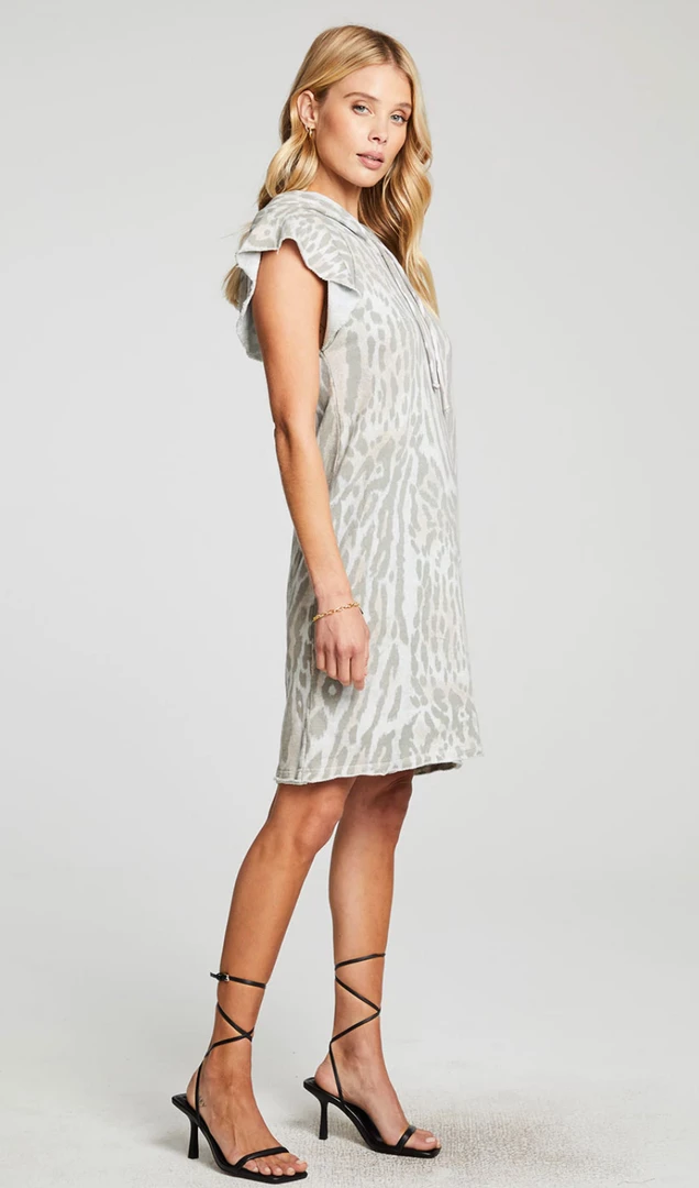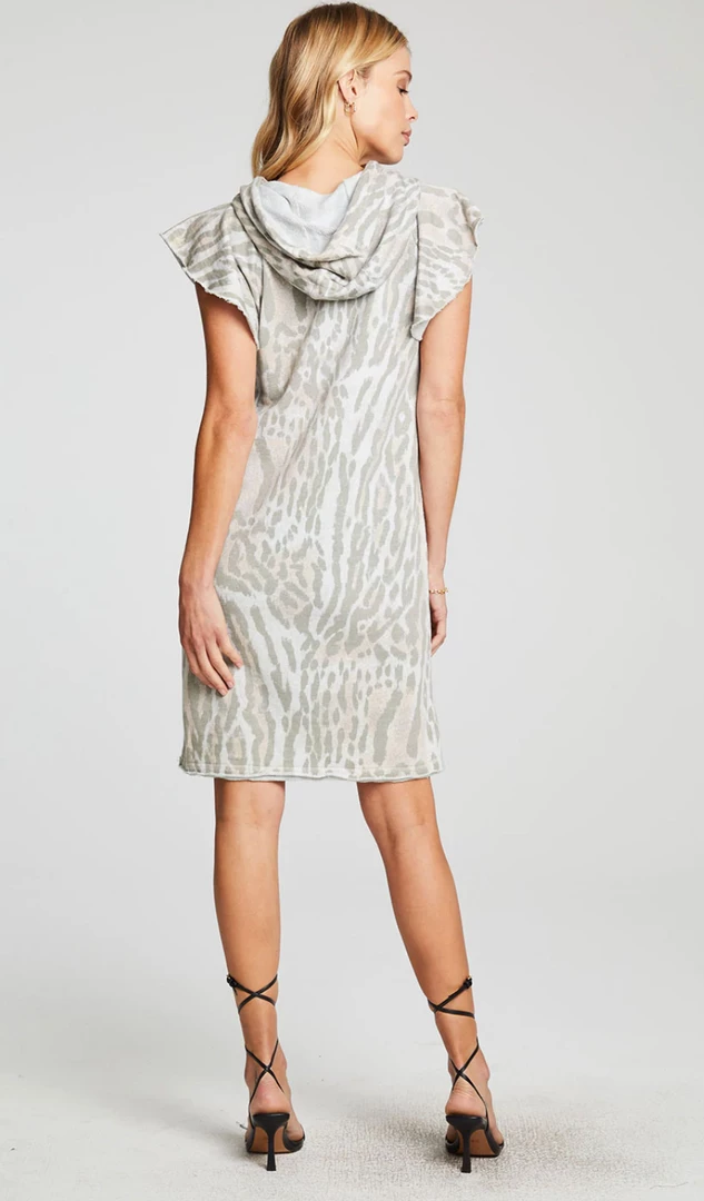 Our Linen French Terry Flutter Sleeve Hooded Sweatshirt Dress features imported fabric.