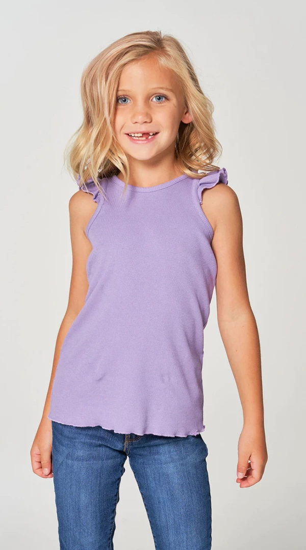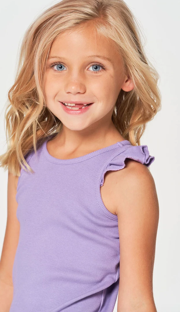 Sun’s out, tank’s out! Stock up her top drawer with the ‘IT’ style of the season: our Girls Recycled Vintage Rib Ruffle Racer Tank in purple. It’s soft, playful and pairs well with just about anything and everything—especially a big smile!
