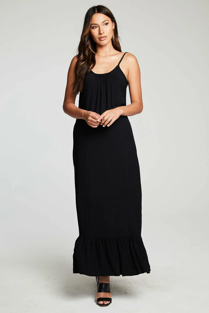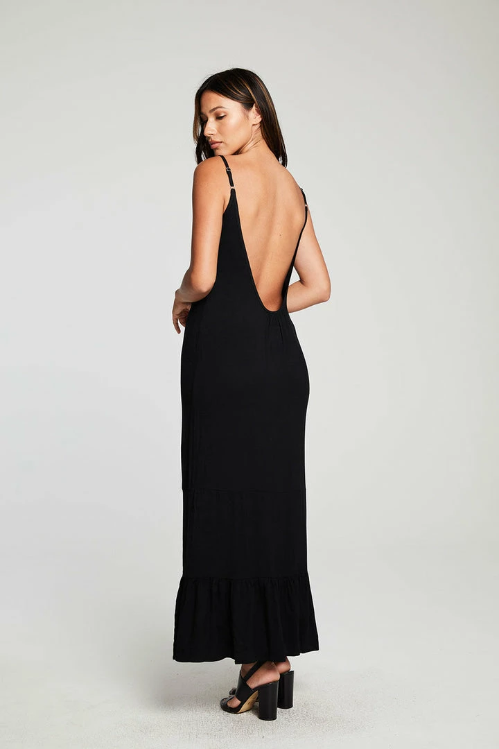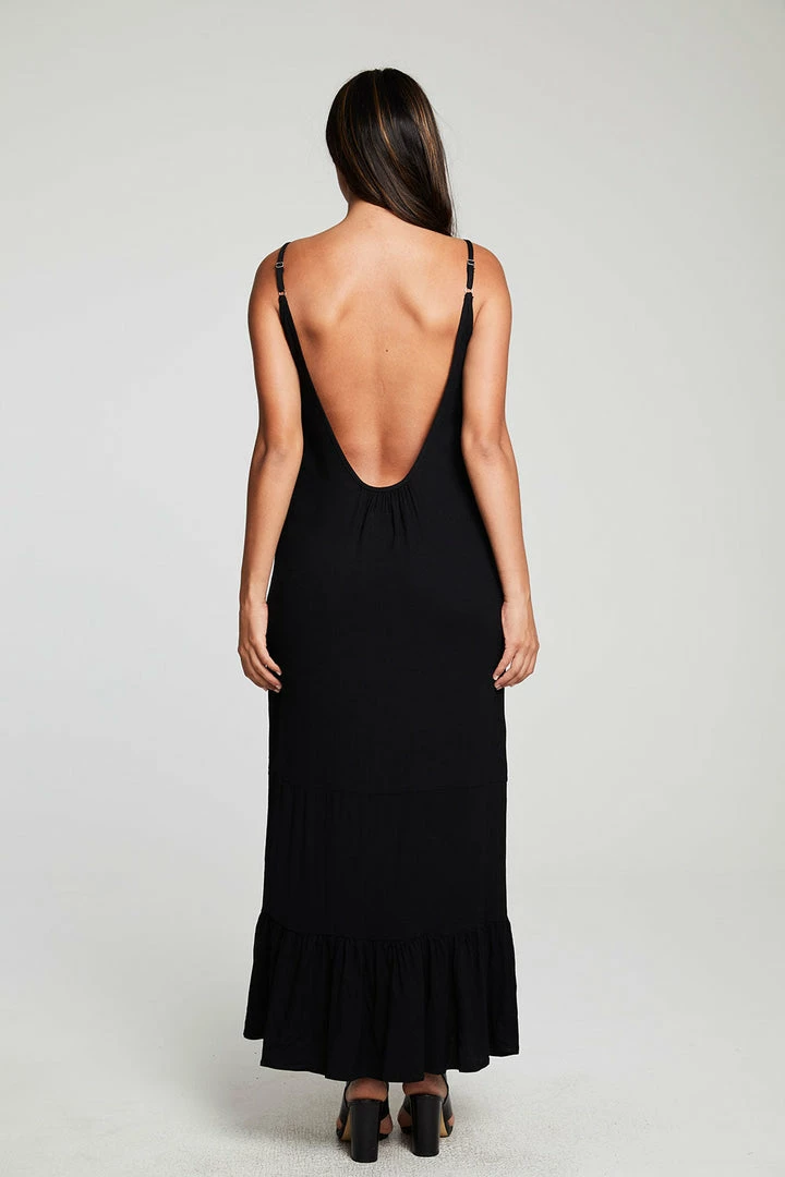 Our Heirloom Wovens Tiered Low Back Maxi Sundress features a thick ruffled tier at the hemline for added flair.