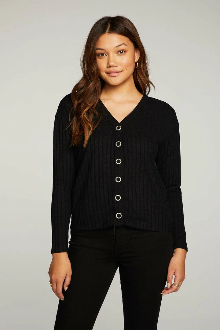 This Polyester rib tee features large metal snap accents down the center—and some stretch for added comfort.