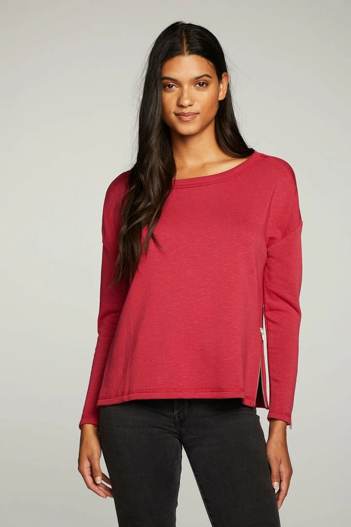 This slub French terry pullover features an open neck and long zipper details at the sleeves and sides.