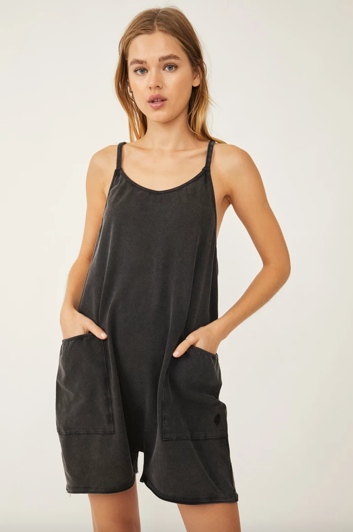 A perfect match for light workout days, or for layering on post-sweat sesh, this soft and comfy romper features a slouchy, pinafore-style design with a scoop neckline and convenient side pockets.
