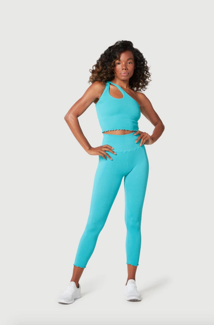 Ethically sourced this All-over Rib 7/8″ legging has a comfort shaped waistband for extra support and hold. Throw in a little frill with the subtle ruffle hem detail.