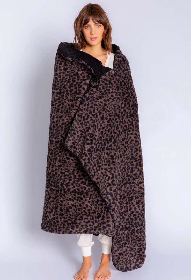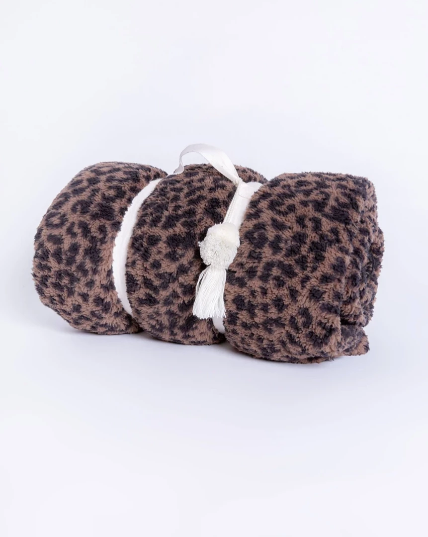 DESCRIPTION: Bring a little modern wild into your mix. Our reversible blanket is a tonal leopard print on one side, with black sheepa fleece on the reverse. A perfect couch throw or for movie nights. Measures 50″ x 65″.
