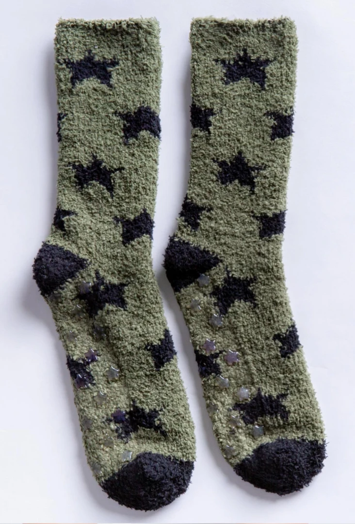 DESCRIPTION: Comfy olive plush socks with black star-pattern to get a little trend onto your toes. Our coziest sock style with non-skid grippers on soles.
