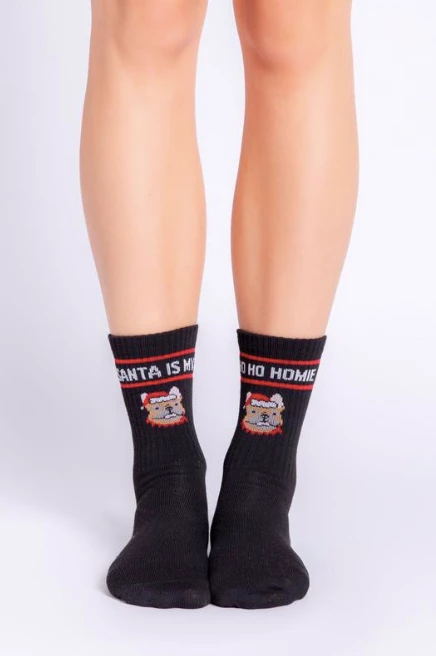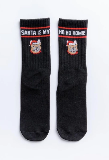 “Santa is my Ho Ho Homie” ribbed socks. These socks are meant to be worn with shoes, and do not have non-skid grippers on sole.