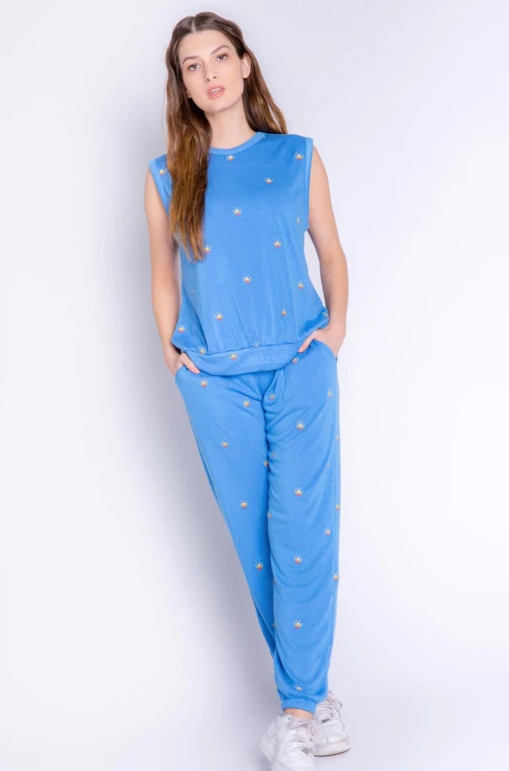 DESCRIPTION: Bright blue terry tank top with cute banded bottom, a boxy fit and allover mini embroidered sunsets.