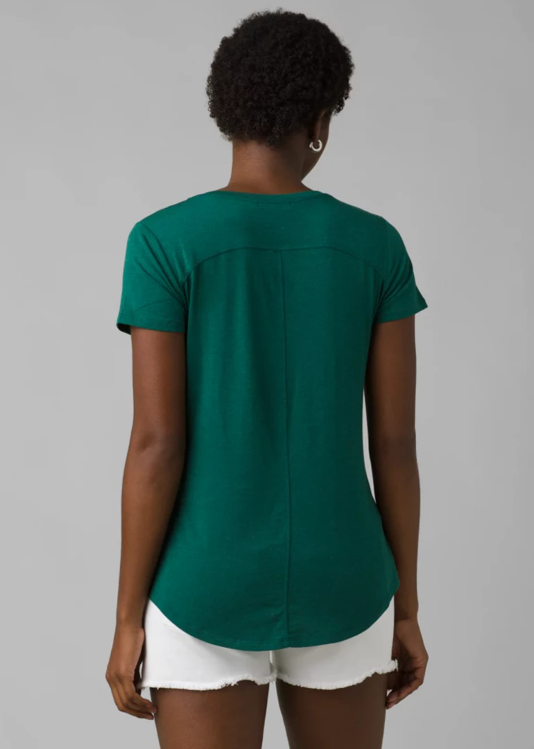- Short sleeved v-neck pocket tee silhouette with back seam details