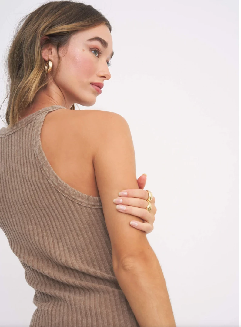 The Elliana Mineral Wash Rib Tank has a high crew neckline and is form-fitting. Made in a soft sweater rib knit and washed with love. This tank easily tucks and layers so your style can go from day to night.