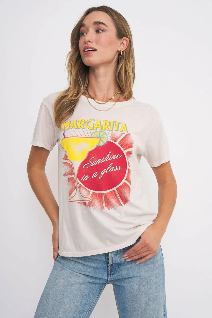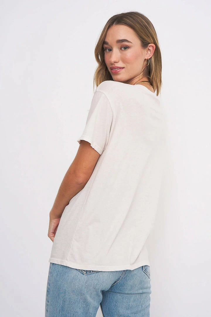 You are vacation ready with this tee. This tee is made from 100% cotton fabric. It has a fun graphic on the front and low hemline. We love pairing this washed tee with a bikini or bike shorts.