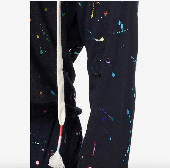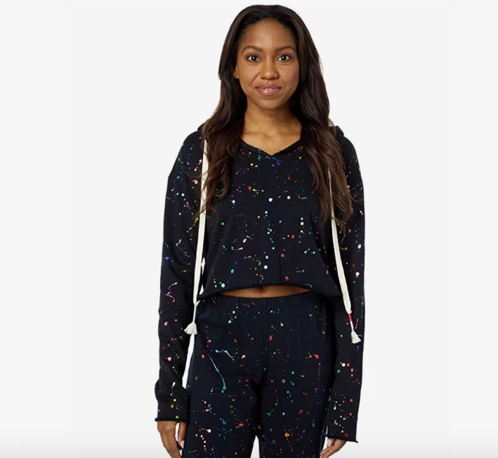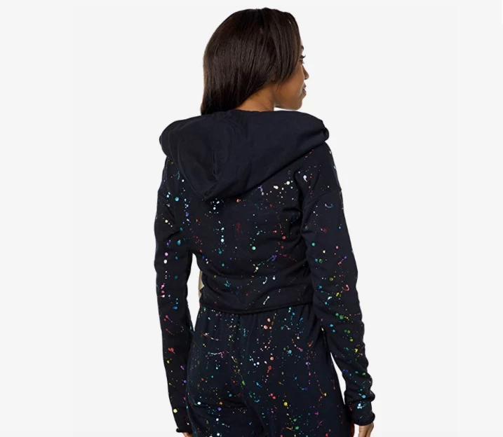 A metallic splatter animates this weekend-official hoodie that’s what to wear when the only project you have planned is picking up the remote.